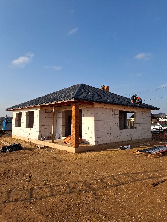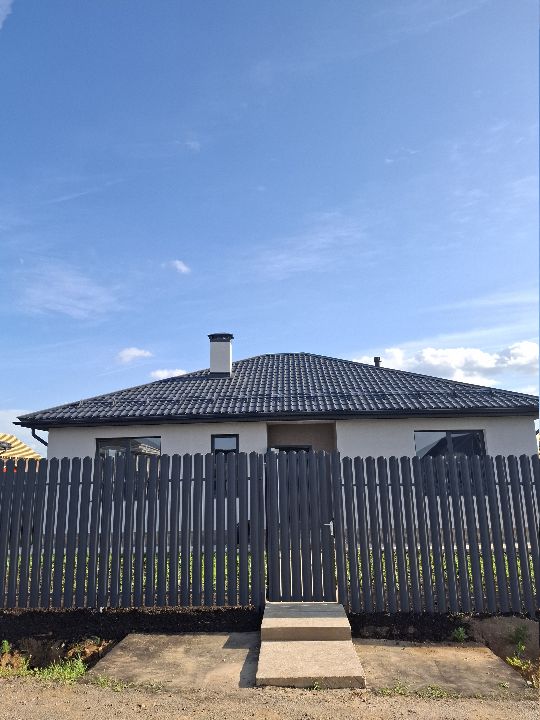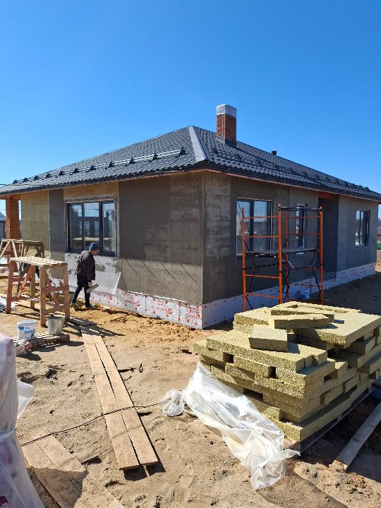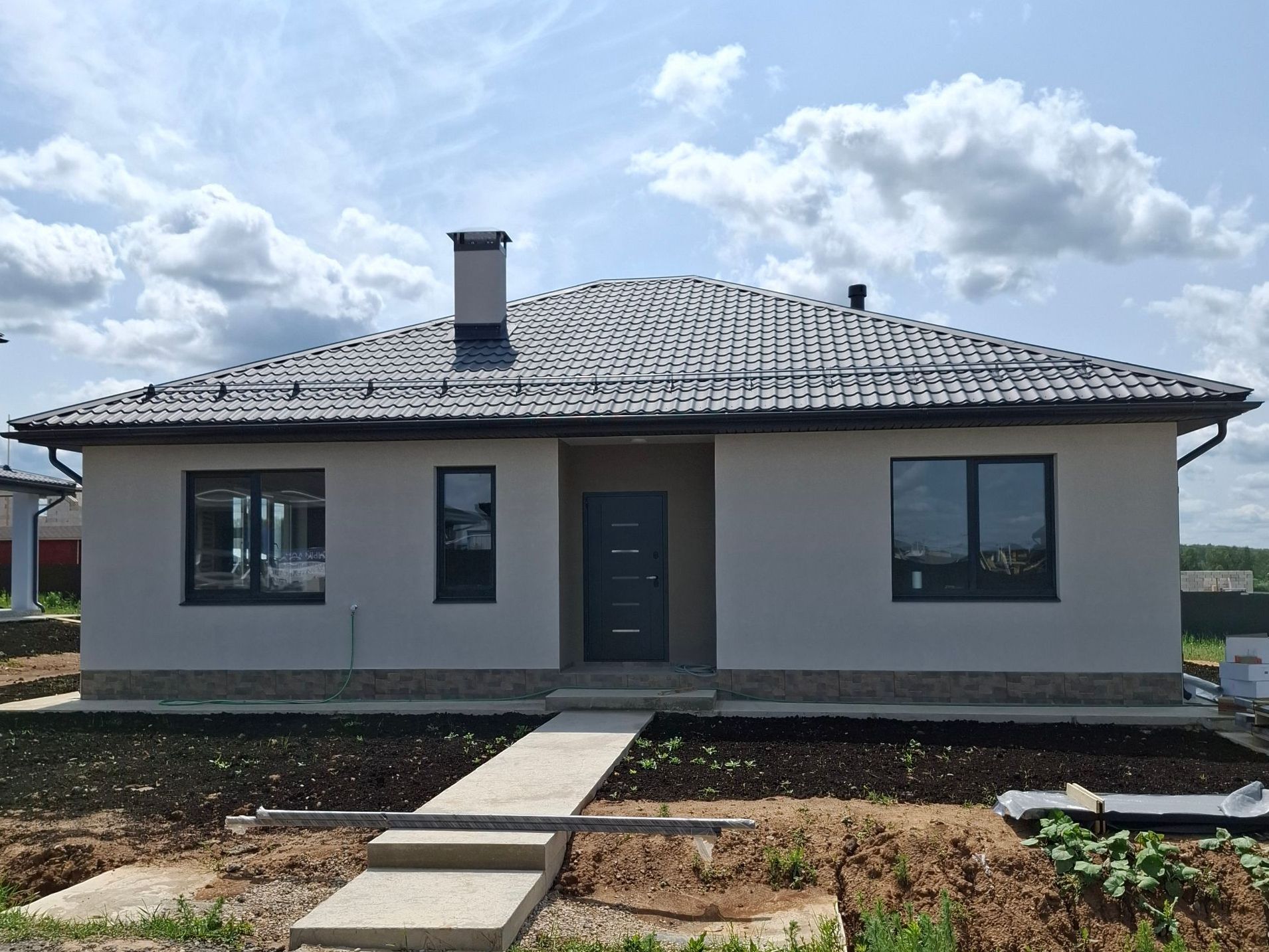 Энергоэффективный одноэтажный дом площадью 120 кв. м. Фундамент дома – плита 300 мм, с дренажем и отмосткой по периметру. Материал стен – газобетонный блок «Бонолит» 300 мм с утеплением минплитой (100 мм) и декоративной штукатуркой типа «Короед». Кровля с «холодным» чердаком из металлочерепицы от Grand Line. Строительство дома заняло 3 месяца, отделочные работы и благоустройство территории произведены за 4 месяца. Дом готов к проживанию.